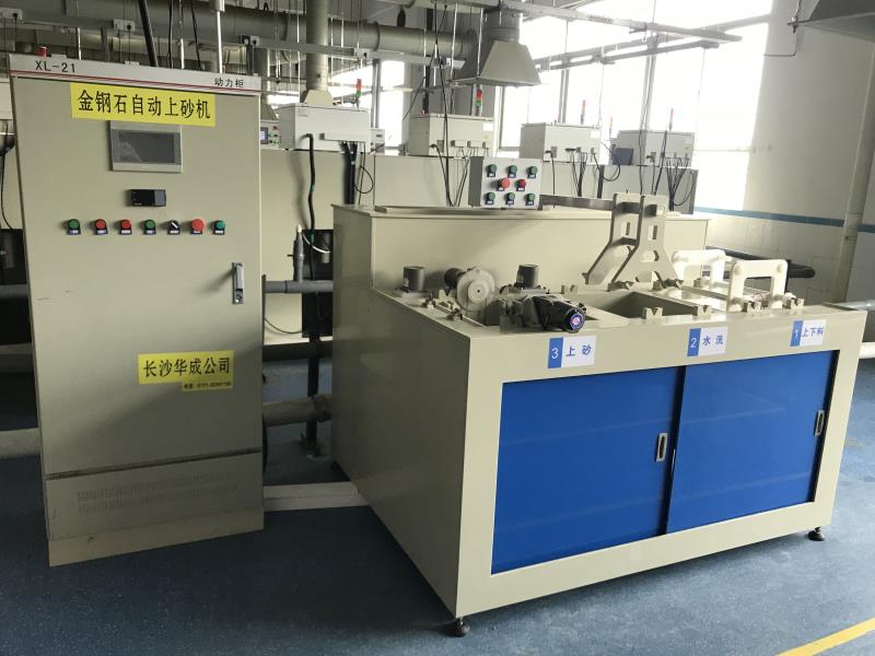 用途:磨頭電鍍、化學(xué)鍍金剛砂的預(yù)鍍、上砂、加厚。配置:鍍鎳槽、鈦陽(yáng)極、整流器、電熱管、溫控器、超聲波、上砂習(xí)布筒、攪拌裝置、機(jī)械傳動(dòng)裝置、自動(dòng)控制電氣柜等工藝配套設(shè)備。功能:工裝自動(dòng)旋轉(zhuǎn),更能定時(shí)90度自動(dòng)翻轉(zhuǎn)并復(fù)位,持續(xù)鍍鎳。效果:鍍層均勻,節(jié)省人工,生產(chǎn)效率高;可建全自動(dòng)生產(chǎn)線。